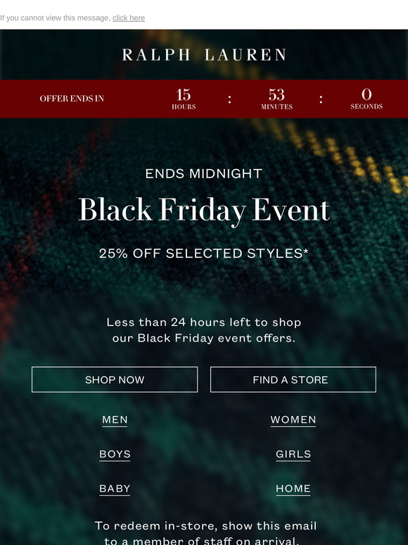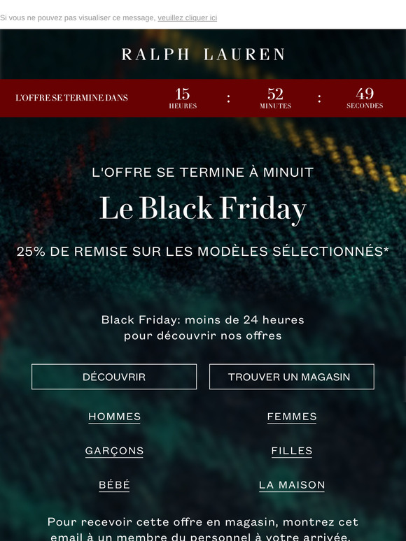 | | Ralph Lauren Black Friday| l'offre de 25 % de remise se termine à minuit | | | | |